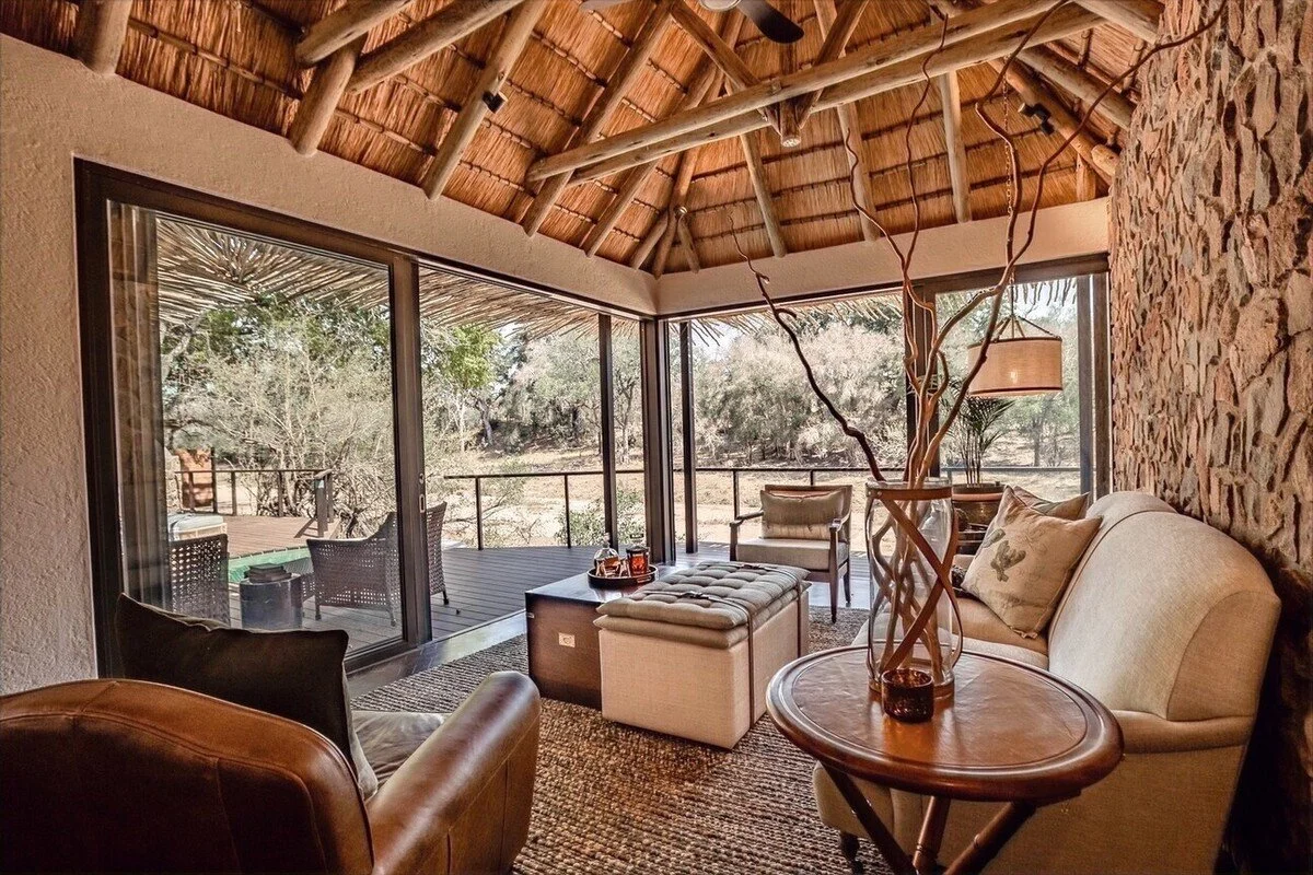 The main lodge, resplendent with deep couches and contemporary African accents spills onto the cool veranda, offers views to the wilderness beyond. There are six exquisite thatched suites all with their own plunge pool, viewing deck, and cozy lounge. The lodge also boasts a gym, in-room massage treatments, a wine cellar, along with a main pool and viewing deck.
